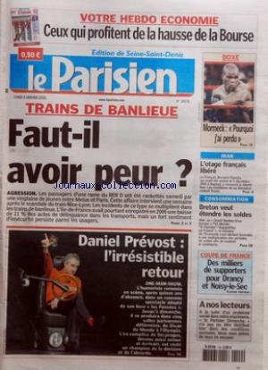 CEUX QUI PROFITENT DE LA HAUSSE DE LA BOURSE - TRAINS DE BANLIEUE - FAUT-IL AVOIR PEUR ? - DANIEL PREVOST - L'IRRESISTIBLE RETOUR - BOXE - MORMECK - 'POURQUOI J'AI PERDU+« - IRAK - L'OTAGE FRAN-œAIS LIBERE - CONSOMMATION - BRETON VEUT ETENDRE LES SOLDES - COUPE DE FRANCE - DES MILLIERS DE SUPPORTERS POUR DRANCY ET NOISY-LE-SEC - CAHIER CENTRAL.
