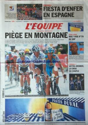 ![EQUIPE (L') [No 20455] du 13/07/2010 - LE TOUR DE FRANCE / PIEGE EN MONTAGNE / LANCE ARMSTRONG - CADEL EVANS - ANDY SCHLECK - CONTADOR - ATHLETISME / BOLT VISE 9 70 AU S.D.F. - F1 / VETTEL-WEBBER / LA CRISE DU COUPLE - FOOT / FIESTA D4ENFER EN ESPAGNE francais EQUIPE (L') [No 20455] du 13/07/2010 - LE TOUR DE FRANCE / PIEGE EN MONTAGNE / LANCE ARMSTRONG - CADEL EVANS - ANDY SCHLECK - CONTADOR - ATHLETISME / BOLT VISE 9 70 AU S.D.F. - F1 / VETTEL-WEBBER / LA CRISE DU COUPLE - FOOT / FIESTA D4ENFER EN ESPAGNE francais](https://images-eu.ssl-images-amazon.com/images/I/51AV%2BvHQ3RL.jpg)