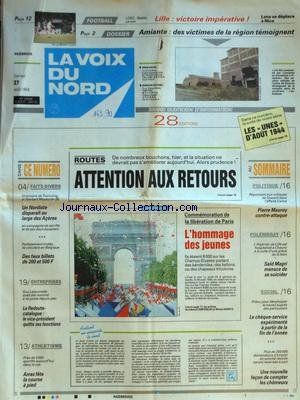 L'HOMMAGE DES JEUNES - COMMEMORATION DE LA LIBERATION DE PARIS - UN NORDISTE DISPARAIT AU LARGE DES ACORES - LA REDOUTE-CATALOGUE - LE VICE-PRESIDENT QUITTE SES FONCTIONS - LES SPORTS - ATHLETISME - FOOT - AMIANTE - DES VICTIMES DE LA REGION TEMOIGNENT - MAUROY CONTRE-ATTAQUE - FOLEMBRAY - SAID MAGRI MENACE DE SE SUICISER -